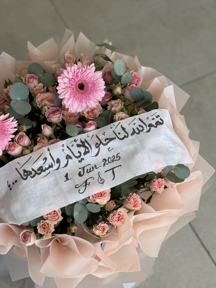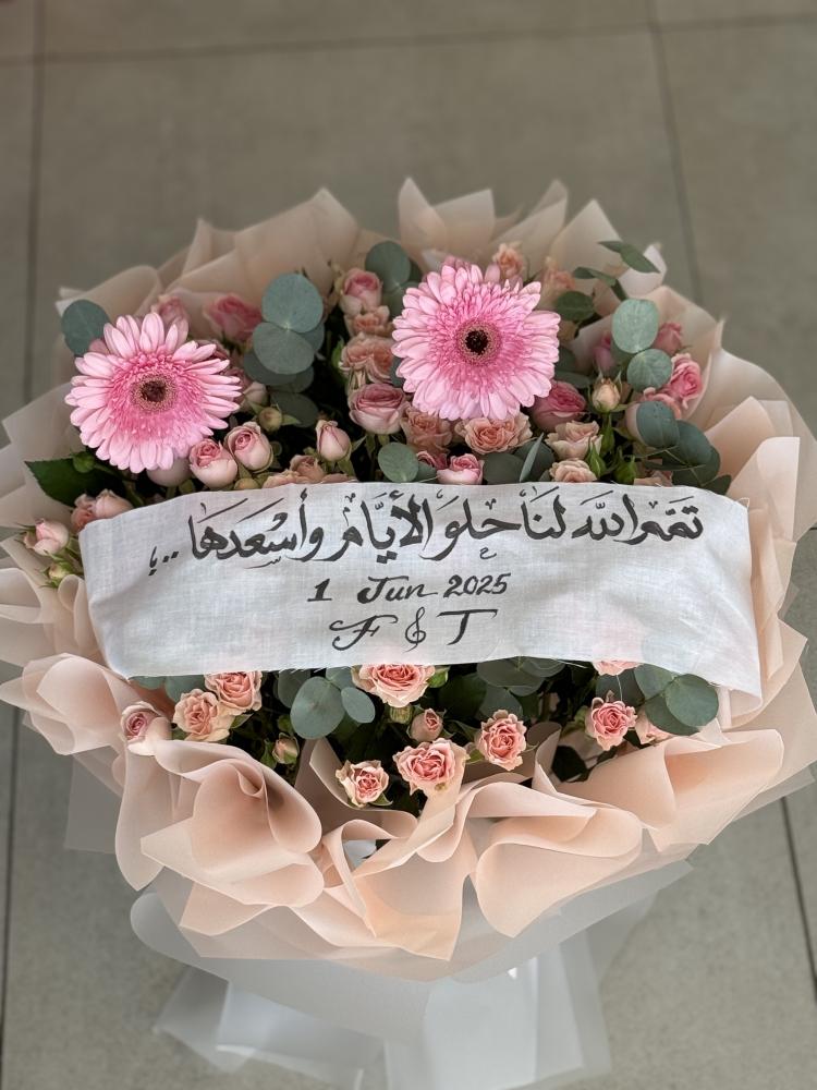 💐 تنسيق فاخر يجمع بين الورود البيضاء والزهور الوردية أو الذهبية (حسب اختيارك)، ليعكس صفاء النية ودفء المشاعر.